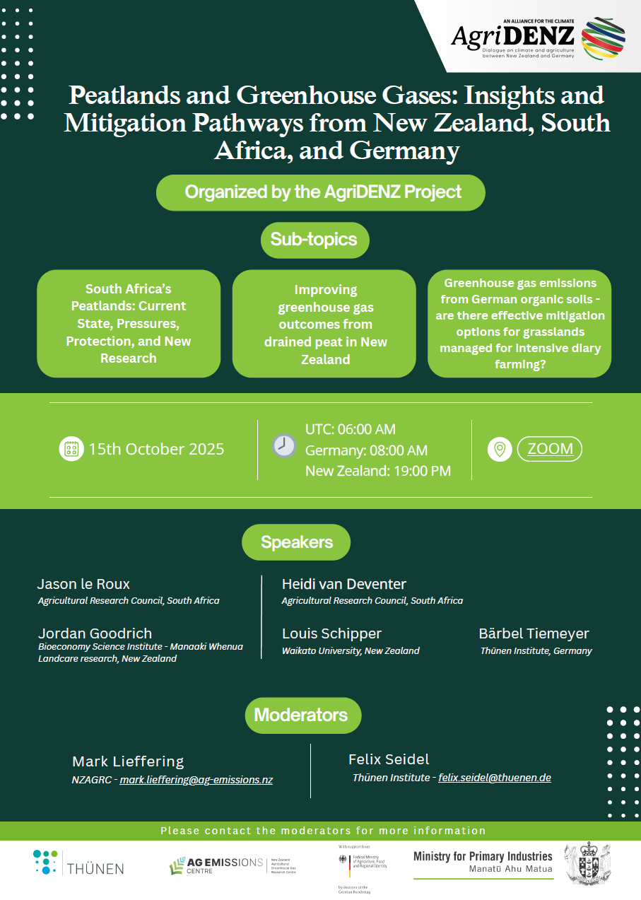 On October 15, 2025, the AgriDENZ project organized an online workshop on Peatlands and Greenhouse Gases: Insights and Mitigation Pathways from New Zealand, South Africa, and Germany.